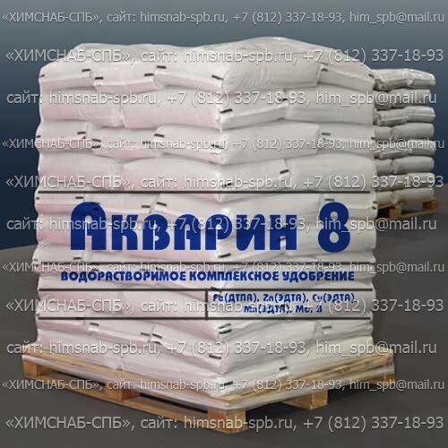 Купить микроудобрение "Акварин 8" относится к "" эффективной форме водорастворимых удобрений, питательных веществ. Состав минерального удобрения wholesale akvarin 8 % N : P : K + MgO + S + м/э составляет: 19-6-20+1,5+1,4+Мэ в хелатной форме. Компания Химснаб-Спб осуществляет продажу оптом, купить водорастворимые комплексные минеральные удобрения комплексные минеральные удобрения. Фасовка комплексного минерального удобрения "Акварин 8": 20 кг, мешок. (Упаковка комплексных удобрений: паллеты: 50х20кг)
