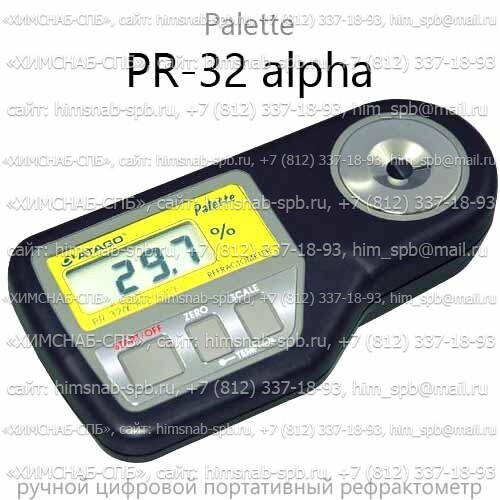 Купить PR-32 alpha цифровой рефрактометр Palette (Atago) - PR-32 alpha Palette digital Refractometer (Atago) количественный и структурный анализ, определение физико-химических параметров вещества - карманный портативный цифровой рефрактометр - современный лабораторный прибор Atago Серия Palette, Atago Palette Series измеряющий показатель/коэффициент рефракции/преломления света в среде. Производитель Atago, прибор refractometer высокая точность (±0,1 %Brix) и встроенная функция автоматической температурной компенсации. Модель PR-32 alpha позволяет с большой точностью измерять низкоконцентрированные и среднеконцентрированные образцы, такие как соки, газированные напитки, различные блюда, кофе; а также в промышленности, например, для определения концентрации СОЖ. Калибровка: чистой водой или рефрактометрической жидкостью "Сахарозка".